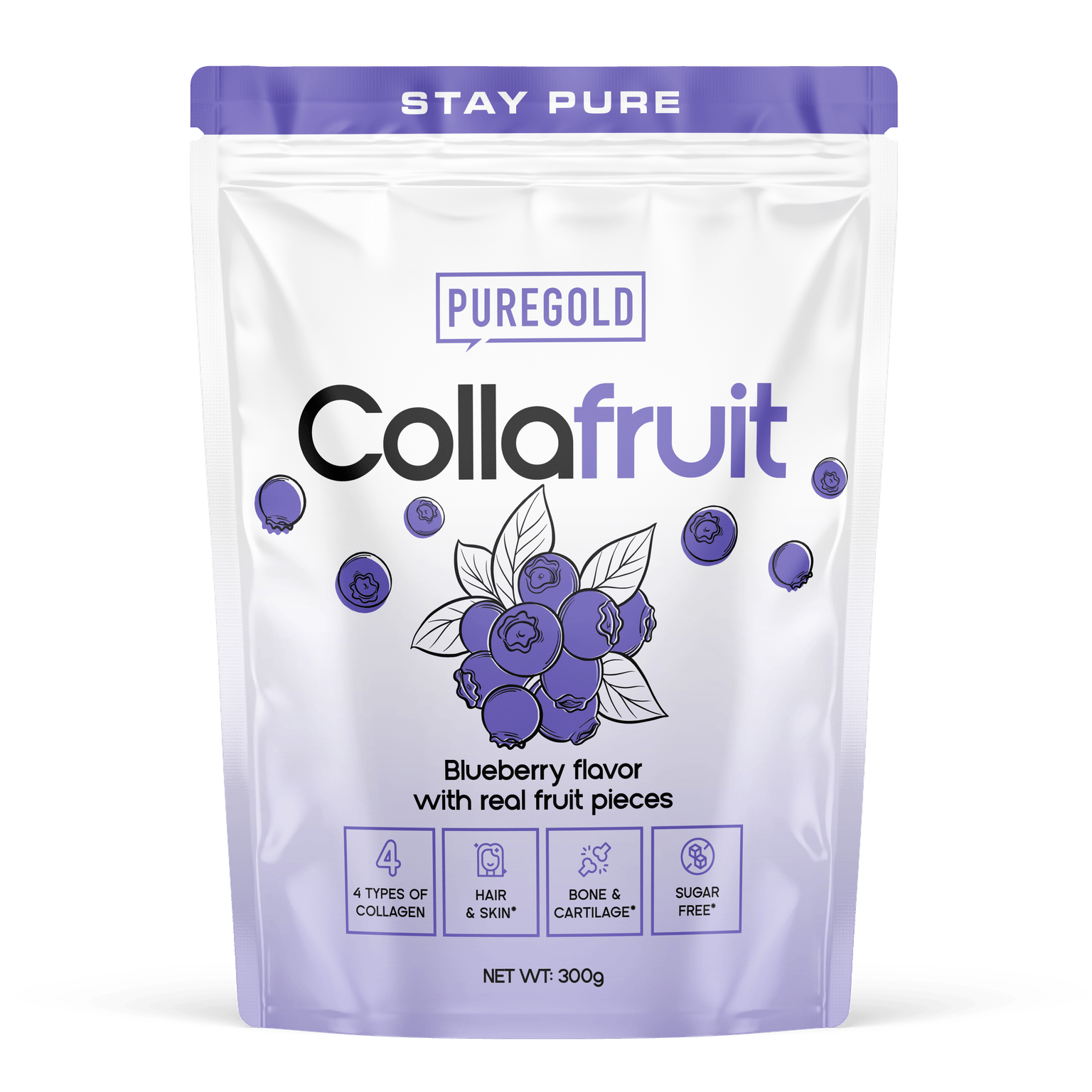 Összetevők: Hidrolizált marha kollagén, liofilizált áfonyadarabok, savanyúságot szabályozó anyag (vízmentes citromsav), aroma, L-aszkorbinsav, édesítőszerek (aceszulfám K, szukralóz), étkezési só, cink-biszglicinát, szelénnel dúsított szárított élesztő, színezék (brilliánskék FCF), retinil-acetát.
