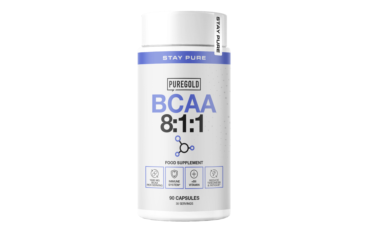 BCAA 8:1:1Étrend-kiegészítő kapszula aminosavakkal, C-vitaminnal és B6-vitaminnal.